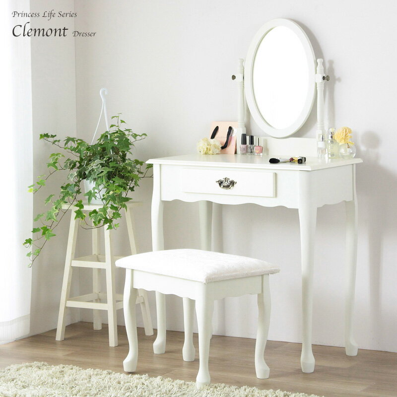 -サイズ- ドレッサー:幅71.5×奥行43.5×高さ128.5cm(天板高75cm) スツール:幅48.5×奥行36.5×高さ42cm -材質- 天板:MDF、塗装 脚部:天然木、塗装 スツール座面:ポリエステル、ウレタン -仕様- 色:アイボリー 引き出し付き ミラー角度調節可 お客様組立品[組立の目安:約30分] -配送- 玄関先お届け -お届けの目安- 1営業日後出荷/2-3日後お届け ※土日祝は出荷不可 -配達日時指定- 指定可 -追加送料が必要な地域- 沖縄県全域/離島(金額は事前にお問い合わせください)アンティーク風 姫系ドレッサー 専用スツールセット Clemont/クレモント本体:幅71.5×奥行43.5×高さ128.5×天板高75cm/スツール:幅48.5×奥行36.5×高さ42cm ■この商品の関連アイテム 姫系デスク 姫系チェア 女性のあこがれ「お姫様スタイル」なドレッサー。
