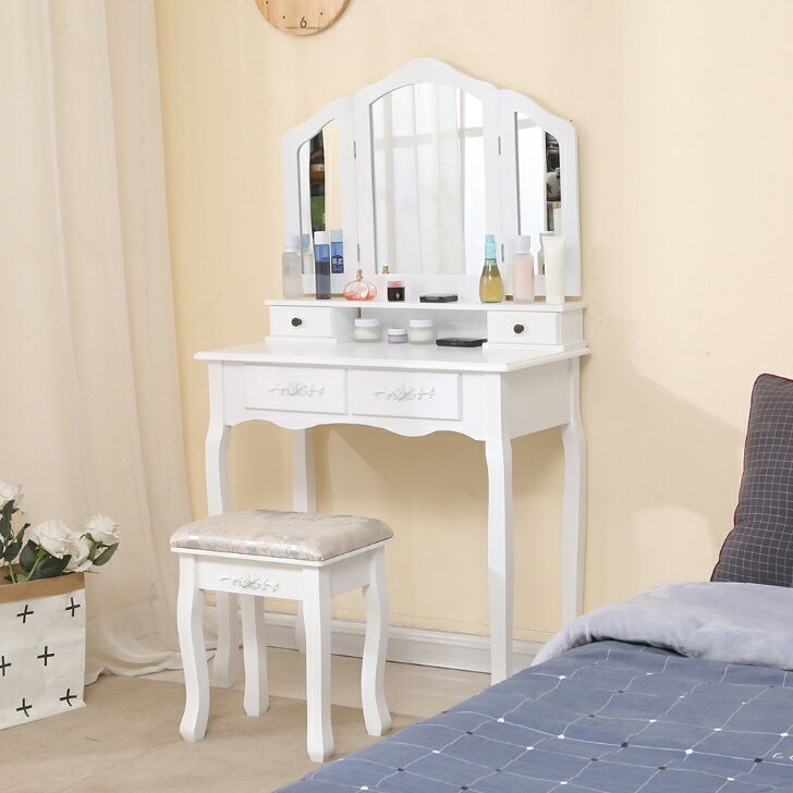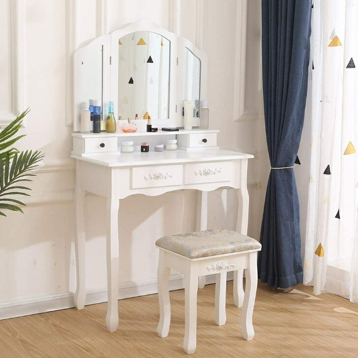 送料無料 ドレッサー 三面鏡 姫系 鏡台 兼デスク 北欧 可愛い 化粧台 白 スツール メイク台 引き出し付き 調整可能 レリフ付き 小物収納 レトロスタイル おしゃれ 木製 組立品 椅子付き2点セット
