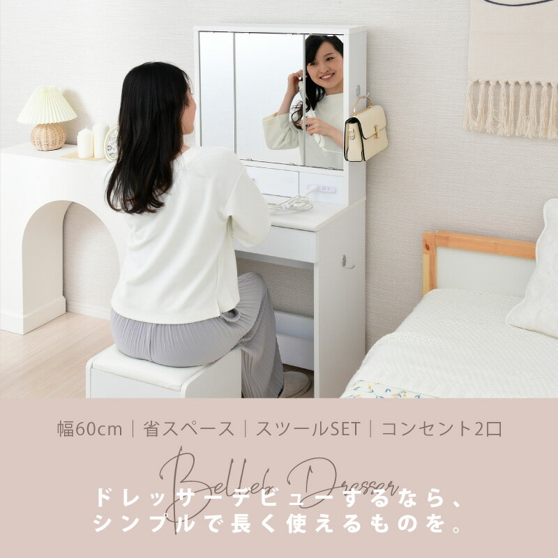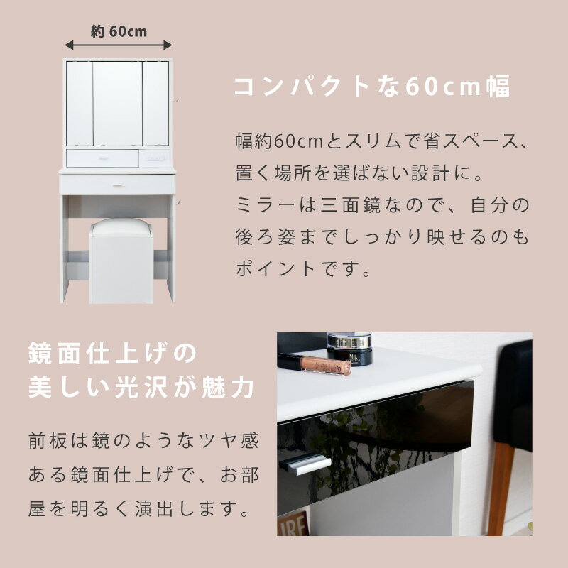 ドレッサー 三面鏡 コンパクト デスク スツール付き コンセント付き テーブル 収納 可愛い おしゃれ メイク台 化粧台 メイクボックス コスメ収納 メイク 収納ボックス 机 椅子 北欧 鏡台 姫 幅60cm ホワイト 白 鏡面
