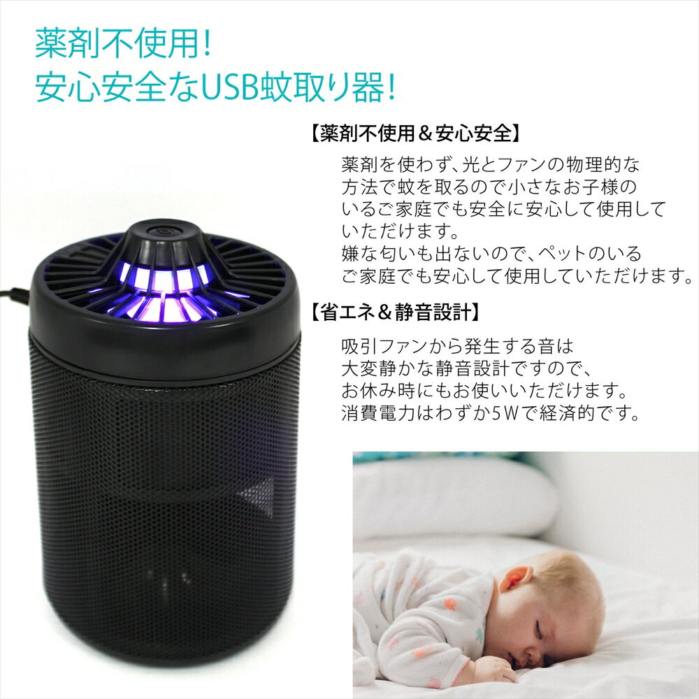 USBで給電できる電子蚊取り器です■商品説明・蚊が好む光の波長と走光性を利用して蚊を360°からおびき寄せ、内部の吸引ファンで吸いこむUSB式電子蚊取り器です。